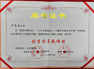 | 2025年6月在海南省六一儿童节大型文艺汇演中指导的组合节目《可爱的中国,亲爱的妈妈》荣获“优秀指导教师奖”!