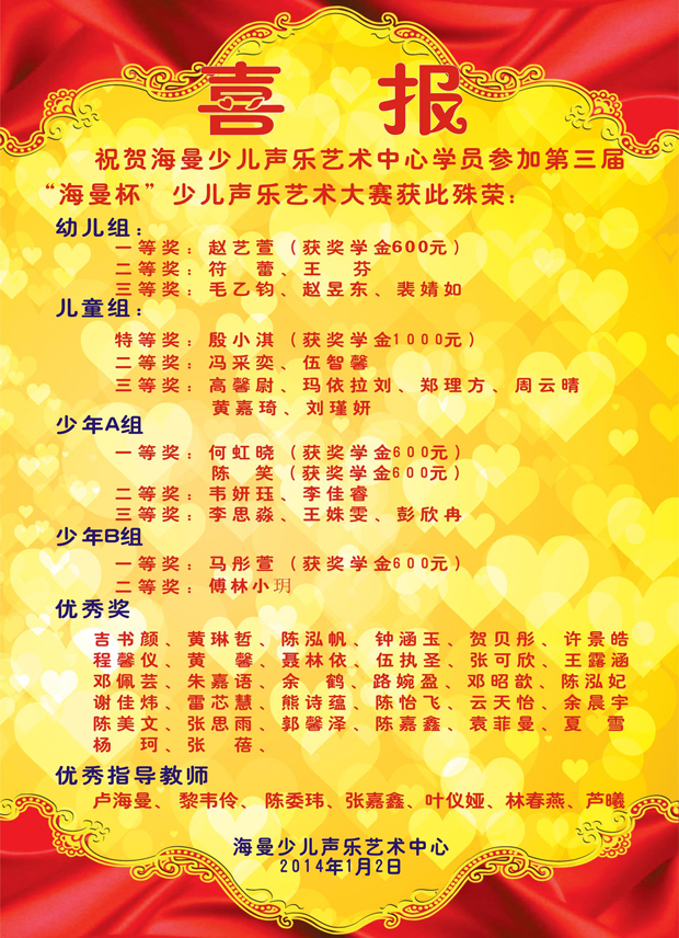 贺我中心学员参加第三届“海曼杯”少儿声乐艺术大赛获殊荣