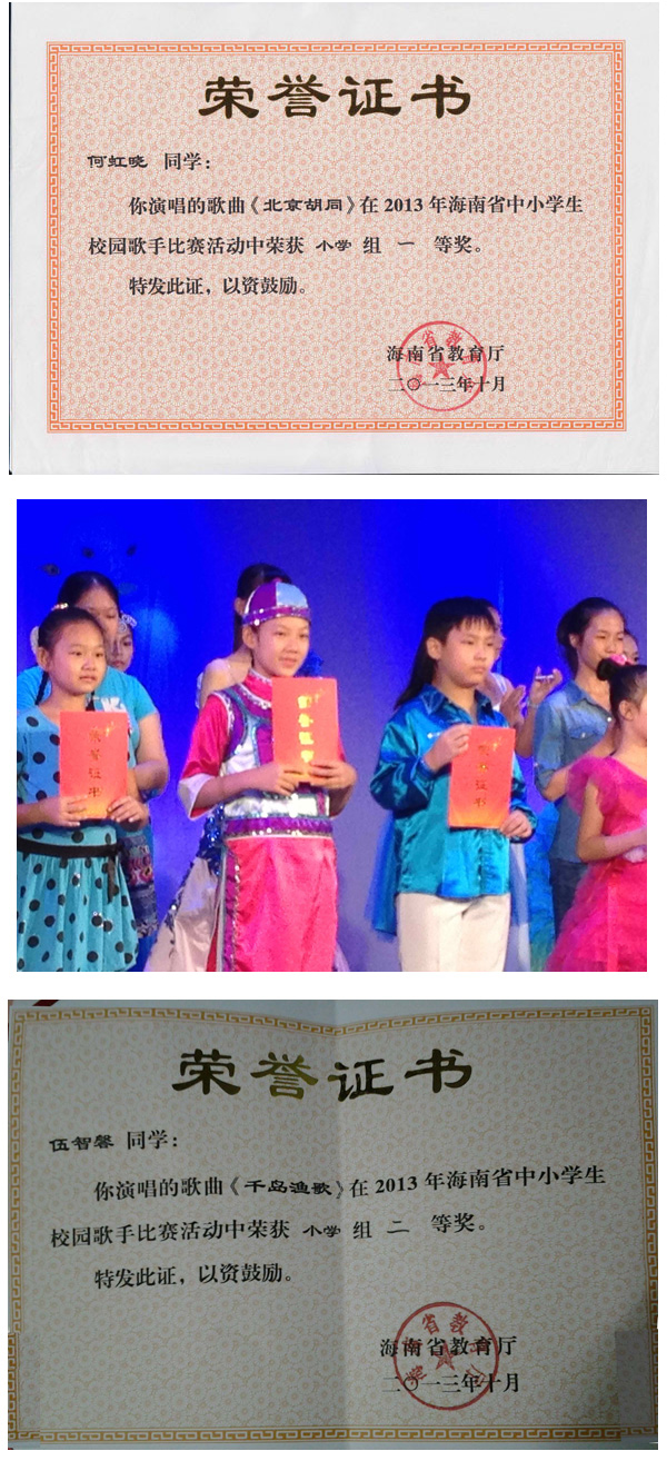 贺我中心学员何虹晓、殷小淇、伍智馨学员参加2013年海南省中小学生校园歌手比赛获此殊荣: