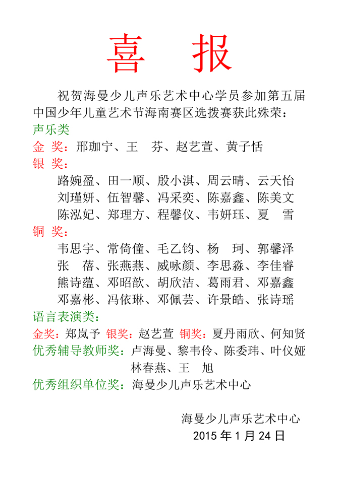 第五届中国少年儿童艺术节海南赛区选拔赛 喜报